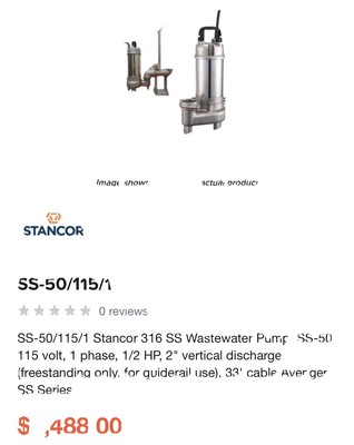 Stancor Model SE-50 submersible effluent pump 5 HP 115 volt 3600 RPM 2 discharge connection 2. Double mechanical seals SiCSiC CACE Solids. 316 stainless steel construction.